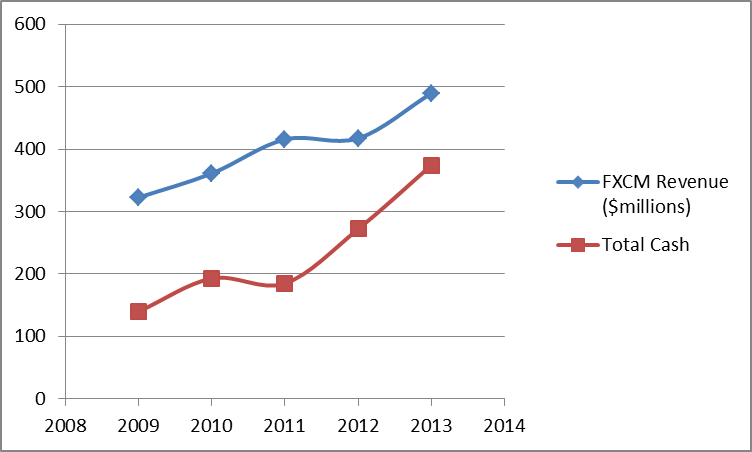 FXCM's $630 million market cap implies that the business is valued at just $420 million, a valuation that is extremely low for such a rapidly growing company (more on valuation in a bit). Over the past several years, FXCM has done an excellent job growing its revenue and its cash stockpile. In fact, FXCM has grown revenue from about $323 million in 2009 to an estimated $489 million this year, an increase of about 51.4% in just five years. Cash on hand has grown 167%, from $140 million to $374 million.