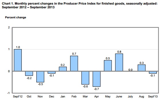 The Producer Price Index for finished goods dipped a seasonally adjusted 0.1% for September, according to a Labor Department report (link opens as PDF) released today.