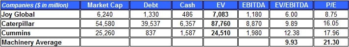 Based on the above, Joy Global's EV-to-EBITDA ratio of only 6 is the lowest of the three companies, even falling below the industry average. In comparison, Caterpillar's EV-to- EBITDA ratio is 9.89, which is close to the industry average.