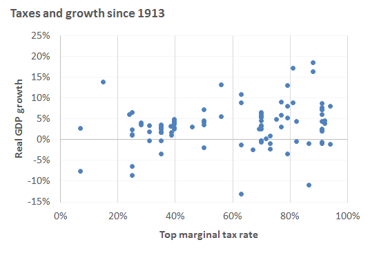 Take the top marginal tax rate and compare it to GDP growth. You get a big mess without much rhyme or reason: