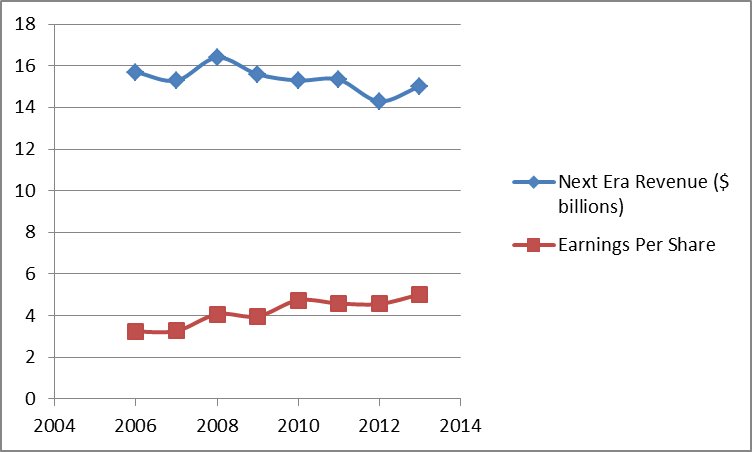 Shares of NextEra have risen by about 25% so far in 2013 due to the reasons indicated above, as well as the improving stock market in general. This translates to a valuation multiple 17.3 times this year's expected earnings. As far as growth is concerned, revenue growth has been pretty flat for a while now, and the same can be said for earnings. So far, the current valuation doesn't really seem to be justified.