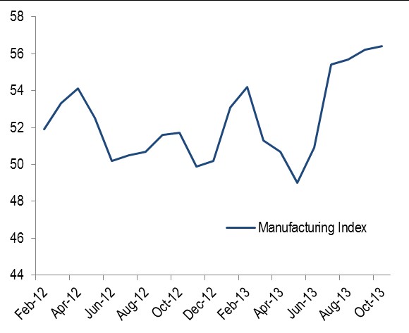 September's index grew 0.5 points to 56.2%, and this latest month's index added on another 0.2 points to clock in at 56.4%. The index is based on surveys of purchasing managers, and any reading above 50% indicates that the manufacturing economy is generally expanding, while a reading below 50% indicates that it is generally contracting.
