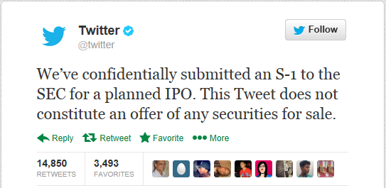 Twitter's announcement of their S-1 filing. Source: Twitter