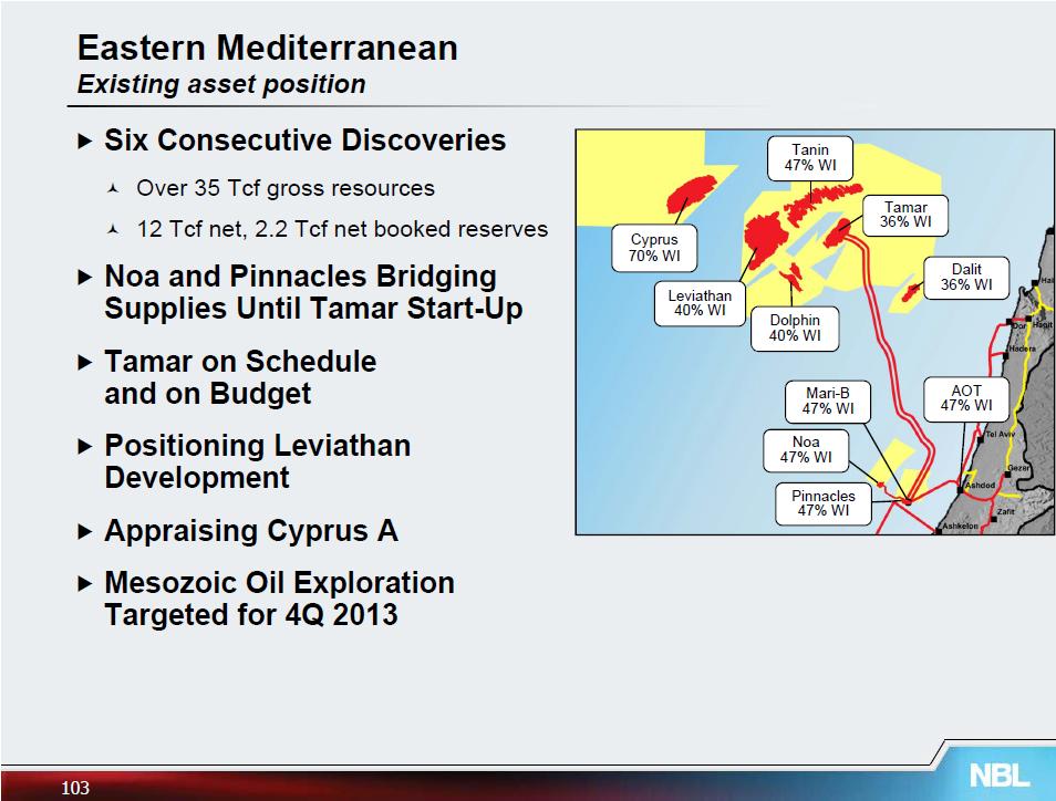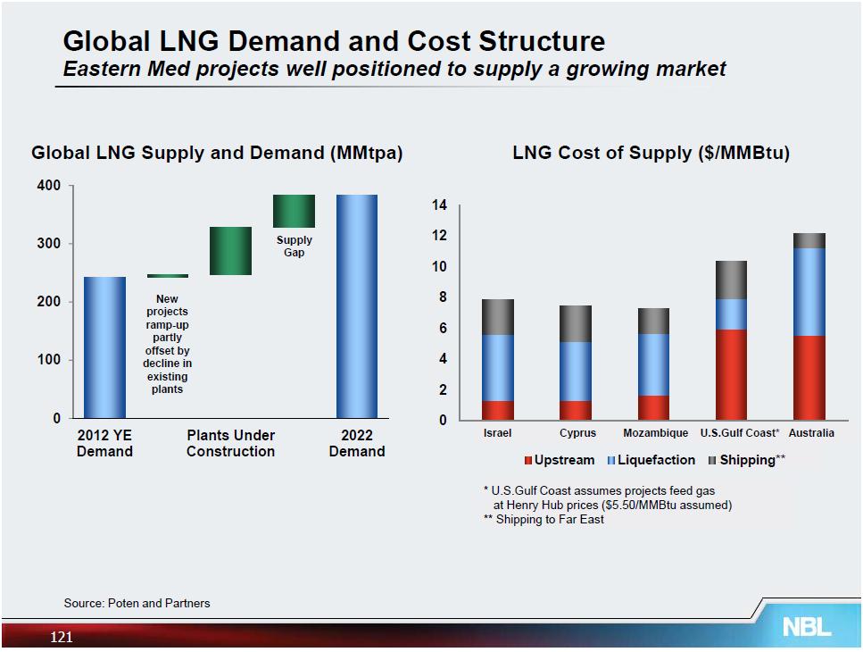 In 2010, Noble Energy and its partners found something in Israel's offshore region that the country had been looking for since the oil embargoes of the 1970's; its own hydrocarbons. You might say that the company and the country found more than they could have hoped for. The Tamar and Leviathan fields are estimated to have as much as 30 trillion cubic feet of natural gas, which is enough gas to supply Israel for decades even if it were to convert all of its energy consumption from coal and oil to natural gas -- with enough left over to export. Noble Energy estimates that this gas field and the planned export projects could net the country more than $130 billion in energy savings and government revenue from gas royalties.