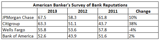 Of these four banks, Wells Fargo had the highest rating among non-customers at 50.6, but it also lost reputational clout in the eyes of its customers when compared with 2011. Although Bank of America's reputation is largely flat over this time period, the 20% jump between 2012 and 2013 shows it's been making significant progress.