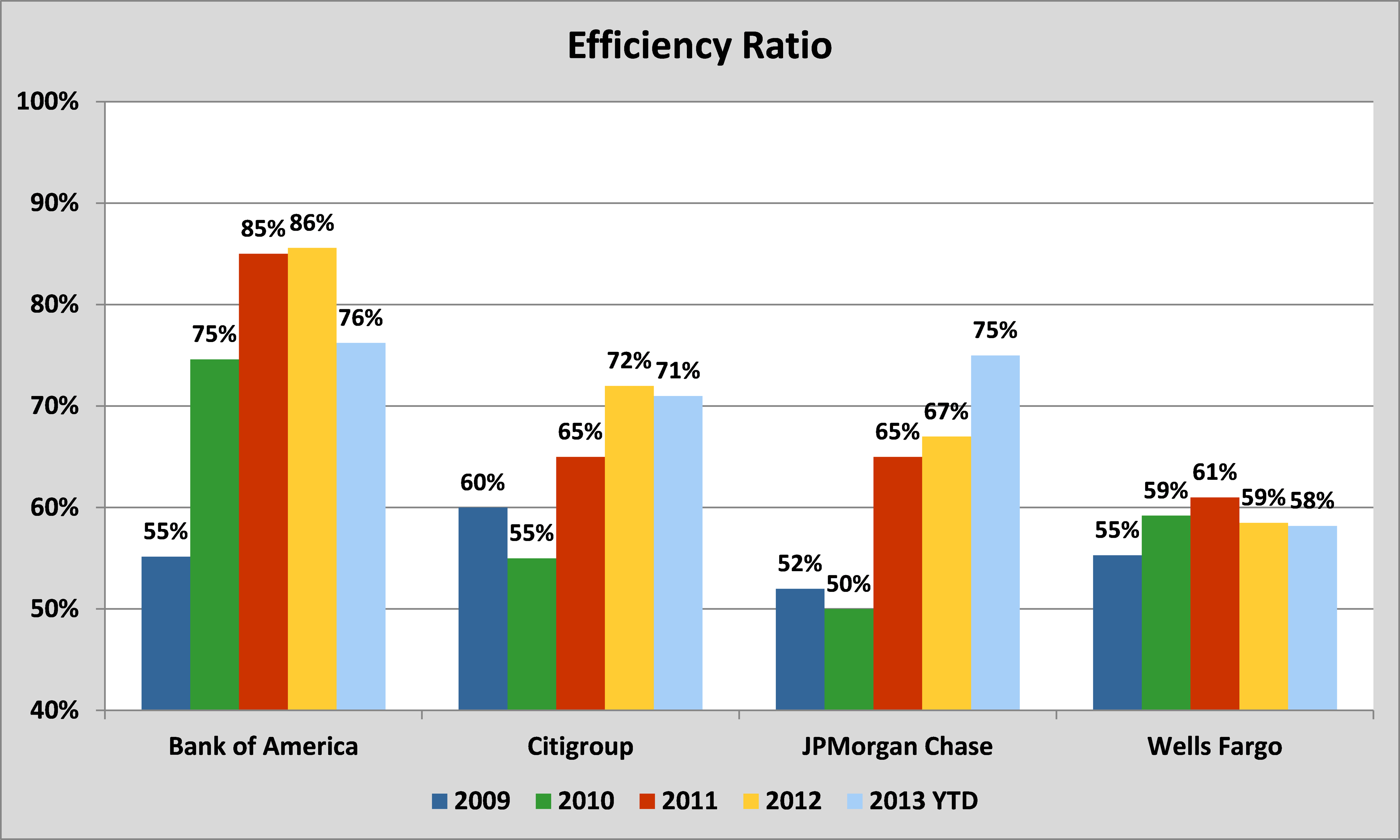 But it'll take more than a shift from asset-lite online and mobile banking to get Bank of America's expenses to where they need to be. Every bank reports an efficiency ratio that measures expenses as a percentage of revenue. It's an important way to see how much it costs the banks to generate each dollar of revenue. As a result of its numerous legal woes, Bank of America has lagged its three major peers in expense management over the past three years. But Bank of America has begun to right the ship in 2013, and its expense ratio is finally moving in the right direction -- down -- and narrowing the separation between it and its peers.