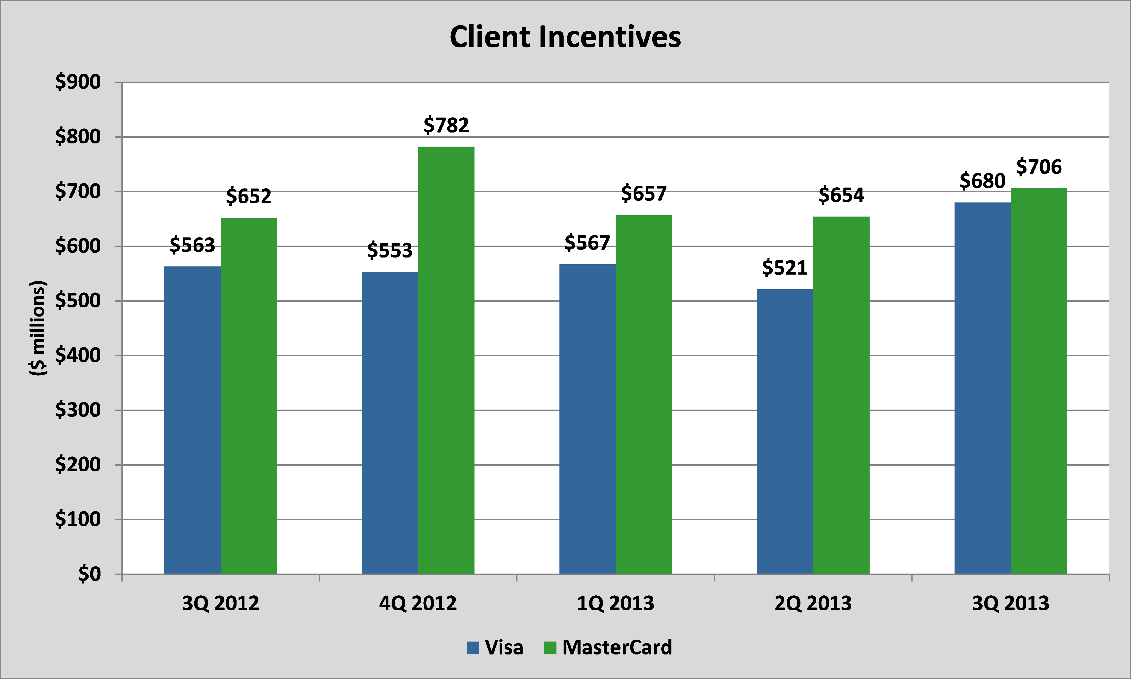 Visa has often paid out significantly less in the form of incentives to its partners than MasterCard -- but that gap narrowed significantly in the most recent quarter: