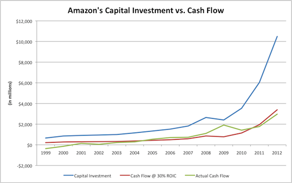 The cash flow argument is that Amazon plows every extra penny it has into fixed assets for growth and generates phenomenal returns from that investment, but the returns are lost within the traditional income statement and balance sheet.