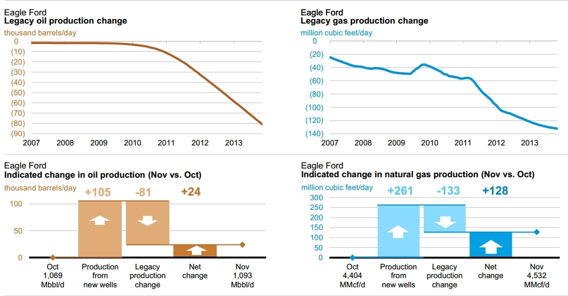 In November 2013 oil production from legacy wells decreased by 81 thousand barrels per day (mbpd) relative to the previous month. This is a serious threat considering oil production growth from new wells was only 105 mbpd. Seeing as legacy net oil production decreased by 30 mbpd from 2012 to 2013, within a year's time the Eagle Ford could see falling total oil production.