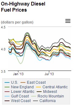 For the same period, average retail diesel prices fell a slightly smaller $0.013 for a national average of $3.857 per gallon. On a regional basis, West Coast prices made the deepest dip at $0.021, while Rocky Mountain prices barely budged, down just $0.008 per gallon.