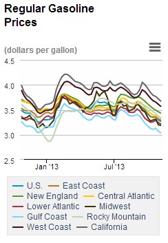 At these latest prices, the West Coast pays the prettiest penny for gasoline ($3.564) and diesel ($4.015). At the other end, the Gulf Coast can guzzle gas for just $3.03 and diesel for $3.769 per gallon.