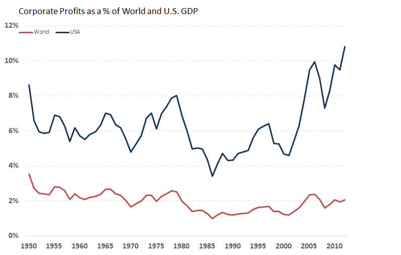 If you take corporate profits and divide them by U.S. GDP, you get a crude measure of profit margins that looks way above the historic average. But using U.S. GDP as a denominator doesn't make sense when U.S. companies have doubled the share of business they do overseas in the past 20 years. Use world GDP as a denominator, and margins don't look that high at all: