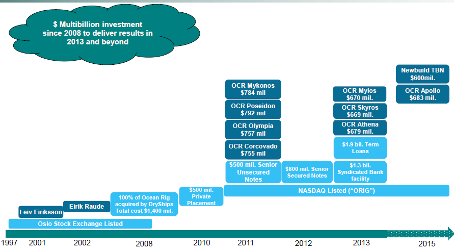 Ocean Rig UDW (ORIG +0.00%) is another offshore drilling company to consider for investment. Ocean Rig owns and operates 10 offshore ultra-deepwater drilling units, of which two are semisubmersible and eight are drillships. Out of these 10, three units will be delivered in 2013 and one in 2015.