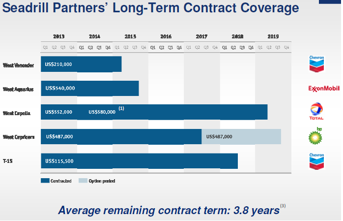 As of the second quarter of 2013, the company had an interest in five rigs: two semi-submersible rigs, two tender rigs, and a drillship. These rigs have an average remaining contract term of 3.8 years and a contract backlog (the total value of contracts to be executed) of $2.5 billion. Seadrill Partners also has the right to acquire rigs from Seadrill Limited, all of which have a contract term of five years or more.