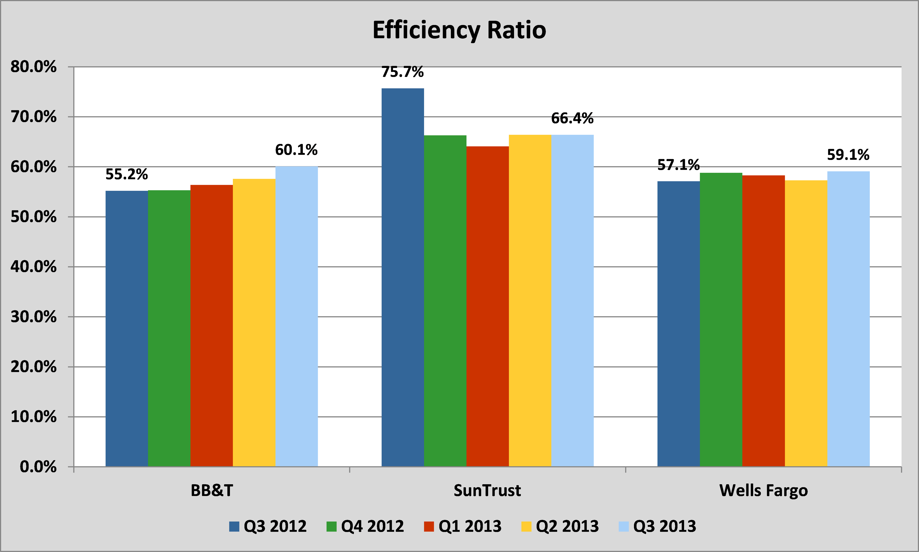 Year to date, BB&T's efficiency ratio is at 58%, compared to 54% last year. This is a troubling trend, especially when measured against its principal comparable competitors. Although Wells Fargo also watched its efficiency ratio rise in the third quarter, year to date the ratio has fallen from 58.5% to 58.2%.