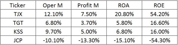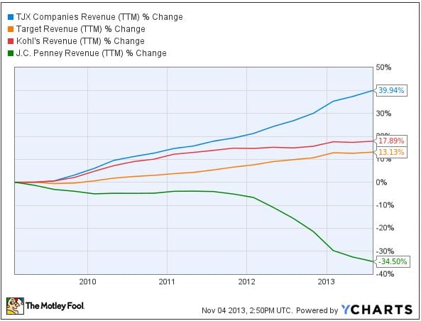 While J.C. Penney is going through a complex and risky turnaround, companies like Target and Kohl's have been doing relatively well during recent years due to their competitive prices in a challenging retail environment. But TJX has still managed to outgrow them by a wide margin.