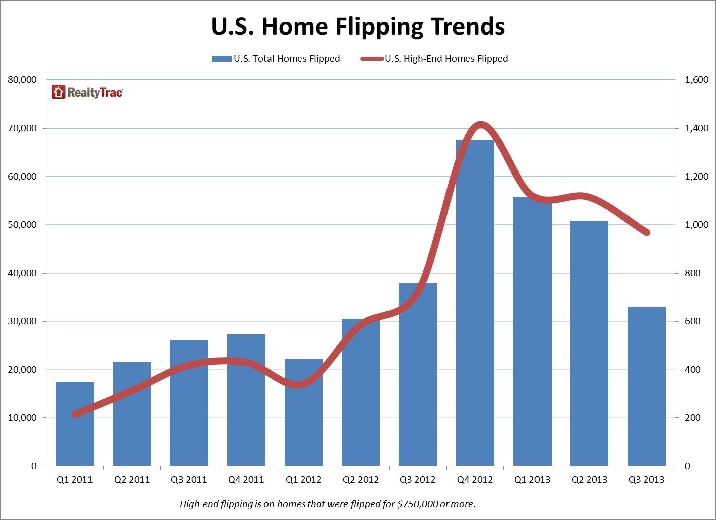 RealtyTrac, a real estate information and research firm, tracks quarterly house flipping data and found that investors flipped 32,993 single-family houses in the third quarter of this year, down 35% from the second quarter and 13% year-over-year.