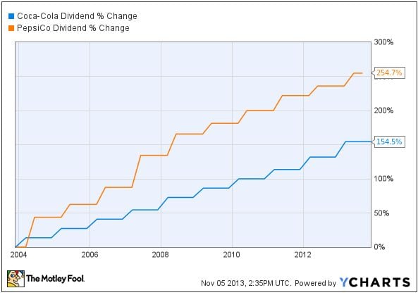 When it comes to dividend growth, however, Coke has a better trajectory than Pepsi over the long term, and the company also delivered a bigger increase for 2013 with a 10% hike versus Pepsi's 6% dividend rise for the year.