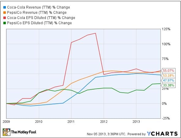 While PepsiCo has outgrown Coca-Cola in terms of revenue over the last five years, Coke is doing better than its rival when it comes to earnings-per-share growth over the same period.