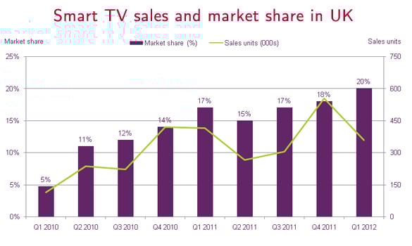 Roughly 123 million smart TV shipments are expected for next year, up 46% from 2012. This promising industry will first take off in developed economies, such as the U.K., where smart TV sales have captured more than 20% of the entire market already. As demand for smart TVs increases, we will observe strong competition between smart TV manufacturers, such as Samsung (NASDAQOTH: SSNLF) and Sony (SNE +0.93%). At the same time, content providers will try to differentiate their services by becoming content creators. How can the retail investor benefit from these technological trends?