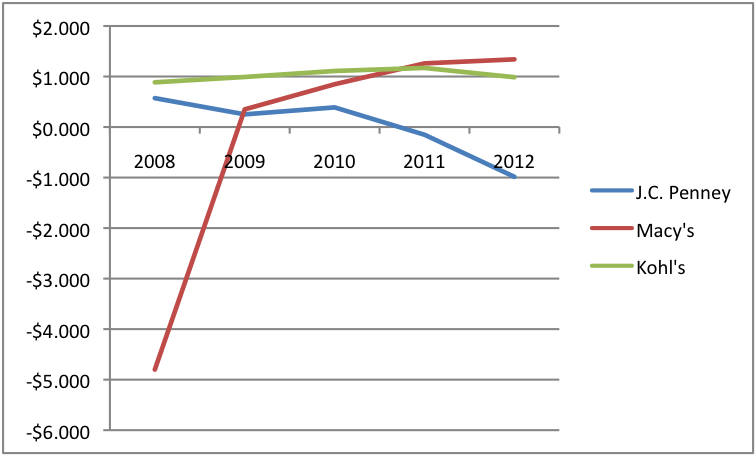 While Kohl's won the battle in terms of revenue growth, we can clearly see that when it comes to net income Macy's has seen the most improvement. Now, in all fairness, Macy's net loss of $4.8 billion in 2008 was due to a one-time impairment of $5.78 billion, but even removing that from the equation makes it the top dog. However, just like in the case of revenue, J.C. Penney comes out on the bottom with net income declining almost every year from $572 million in 2008 to -$985 million in 2012. Once again, investors at J.C. Penney are left losing out as a result.