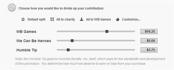 WB's bundle allows consumers to use sliders (pictured below) to choose exactly how much of their purchase goes toward WB Games, the We Can Be Heroes charity, or to Humble Bundle to help with bandwidth and development costs. The We Can Be Heroes charity aims to combat the hunger crisis in the Horn of Africa.