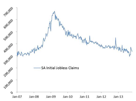 From a more long-term perspective, the four-week moving average also fell 2.6%, to 348,250 initial claims. Both the latest week's claims and the four-week average fall significantly below 400,000, a cutoff point that economists consider a sign of an improving labor market.
