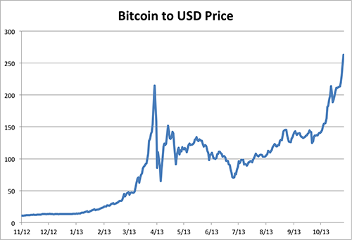 In October the FBI, DEA, and IRS took down the Silk Road, one such online marketplace that dealt in drugs, guns, and hitmen for hire. The government seized about 170,000 bitcoins related to the market, which at the time was worth $33 million and now is valued at $43 million. The shutdown of one of the most well-known black markets caused a slight downward blip in price. But the currency quickly regained the lost value. It's possible that such a shutdown of the seedier aspects of the bitcoin market lends it more legitimacy. And as the story became popular, more were exposed to bitcoins' existence.
