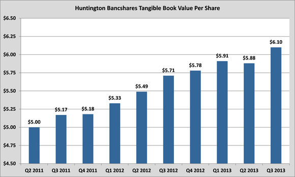 Over the last 10 quarters, Huntington has watched its tangible book value rise by 22% as shown in the chart below: