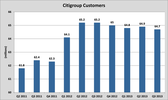 In its most recent earnings announcement, Citigroup disclosed that its total retail customers had fallen from 65.2 million to 64.7 million over the last year, and apart from a minor gain seen from the first quarter to the second, its total customer count has fallen or stayed flat for four of the previous five quarters:
