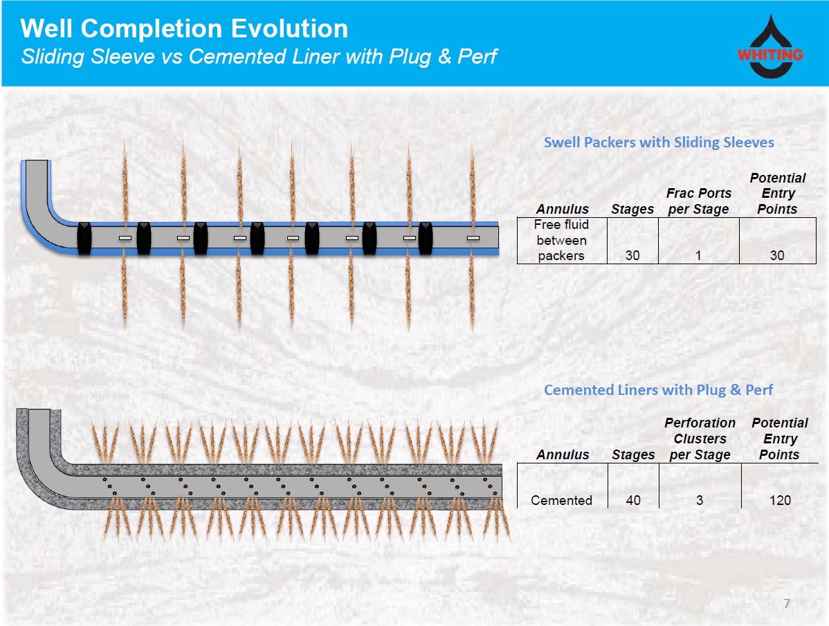 These results are all well and good, but Whiting has stumbled upon something during some of its most recent well completion tests. By changing to a cemented liner, a fracking technique known as plug and perf, and using more proppants such as sand and ceramics, it was able to get much better-performing wells. Whiting estimates that using this well completion technique, it was able to achieve initial production rates that were 75% higher than a well drilled on abutting acreage using the more tried method of using what was called a sliding sleeve.