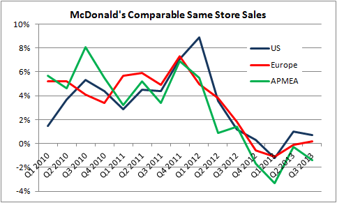 First, the bifurcated economic recovery in the U.S. has hit the quick service restaurant, or QSR, sector particularly hard in 2013. Indeed, the issue was specifically discussed in McDonald's last conference call: "We continue to experience a bifurcation of the consumer base. McDonald's core customers skew toward those customers whose disposable income is not rising as much and are spending a little bit less in QSR."