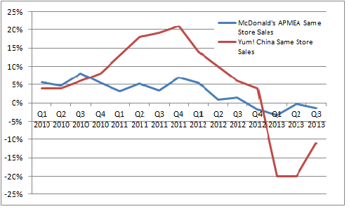 As for Burger King's numbers, it's possible that the company experienced growth because it is relatively under-represented in China, compared to Yum! and McDonald's.