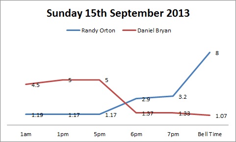 ‟An example I can point to is the Daniel Bryan versus Randy Orton match from Night of Champions on Sept. 15," Taylor continued. ‟At the start of the day, Bryan was +350 underdog with Orton a -530 favorite. By 6 p.m. EST, the pair had switched positions and Bryan was -270 favorite. When I made a final check on the odds right before the bell sounded for their match, Bryan was available at odds of -1500 with Orton at +700."