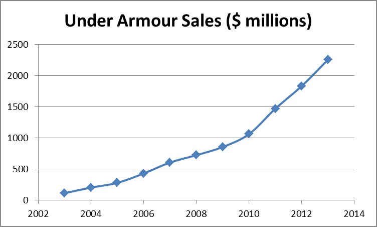 In its relatively short history, Under Armour's growth has been nothing short of spectacular. It seems like until very recently, Under Armour was simply known as the manufacturer of compression undershirts that had a fantastic reputation for wicking away sweat and keeping the wearer comfortable. However, Under Armour has expanded its offerings to a complete line of athletic clothing and sports uniforms, and sales have soared.
