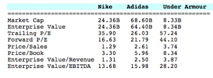 By nearly every ratio, Under Armour is far pricier than Nike or Adidas. You can argue that it deserves the valuation because its growth is high and its opportunities for expansion seem almost limitless at present. Guidance for 2013 was raised to $2.26 billion, a 23% increase over 2012, with operating income expected to grow by 25%. While there should be enough growth to send Under Armour higher, if it simply meets guidance or fails to reach these numbers investors may find a chink in its armor that provides a buying opportunity.