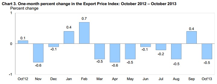 After increasing a revised 0.4% in September, export prices erased their gains with a 0.5% decrease, missing analysts' expectations of a 0.2% increase. Although a 1.5% decline in agricultural prices played a role in the overall decrease, prices for nonagricultural exports also fell 0.4%.
