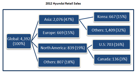 The U.S. ranks as the world's second-largest automotive market after China, and offers big opportunities as it moves toward pre-recessionary sales levels. Edmunds.com predicts sales of light vehicles in the U.S. to hit 16.4 million in 2014 . The U.S. is also Hyundai's most significant market, accounting for 16% of total sales in 2012. Last year, the company sold more cars in the U.S. than in its home market of Korea.