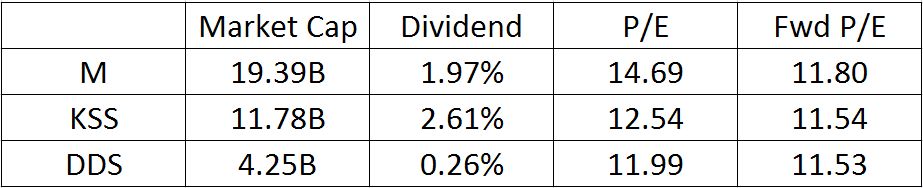 Comparing valuation ratios for Macy's versus Kohl's and Dillard's, the company is trading pretty much in line with its peers. While Macy's is a bit more expensive in terms of trailing P/E ratio, the difference is almost irrelevant when it comes to forward P/E. Kohl's has a higher dividend yield than Macy's, but Macy's beats Dillard's in the dividend department.