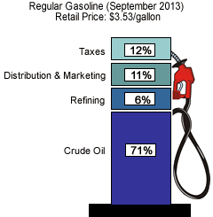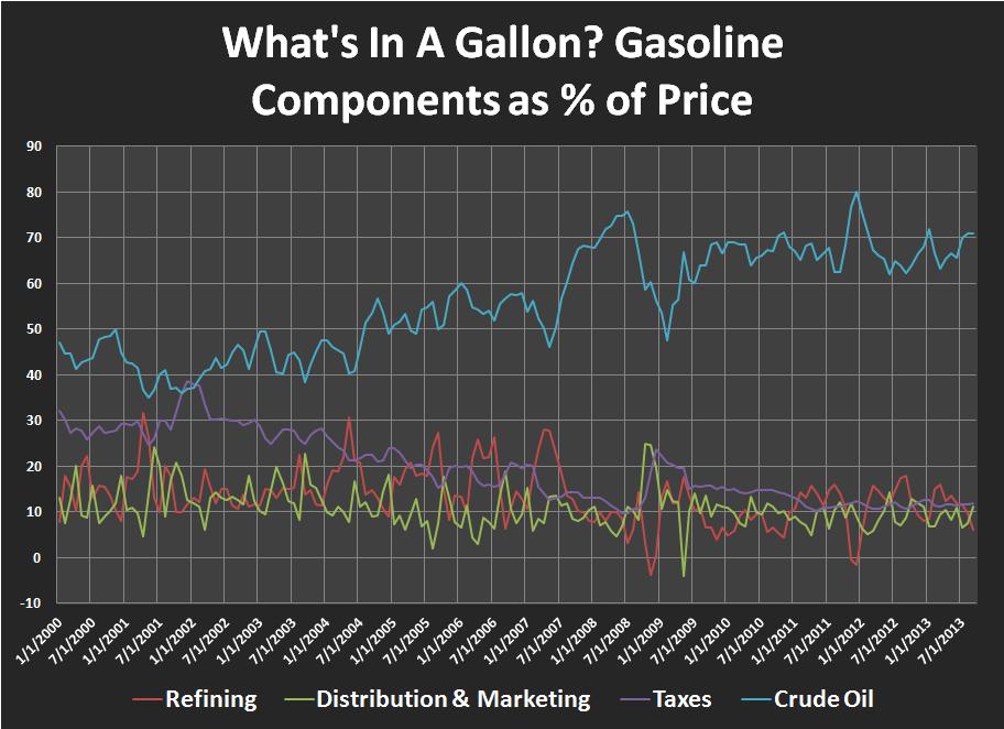 One thing to consider when calculating the price of gasoline; it varies from state to state. Heck, it can even vary from neighborhood to neighborhood. So for the sake of simplicity, we'll only use national averages. The most recent data from the US Energy Information Administration puts gasoline at $3.55 a gallon. Also, as you can see from the picture above, the price of crude oil has a very large part to do with the price of gasoline. As the price of gasoline changes, though, so too does the breakdown of gas prices. This is because some items such as taxes can be fixed amounts.