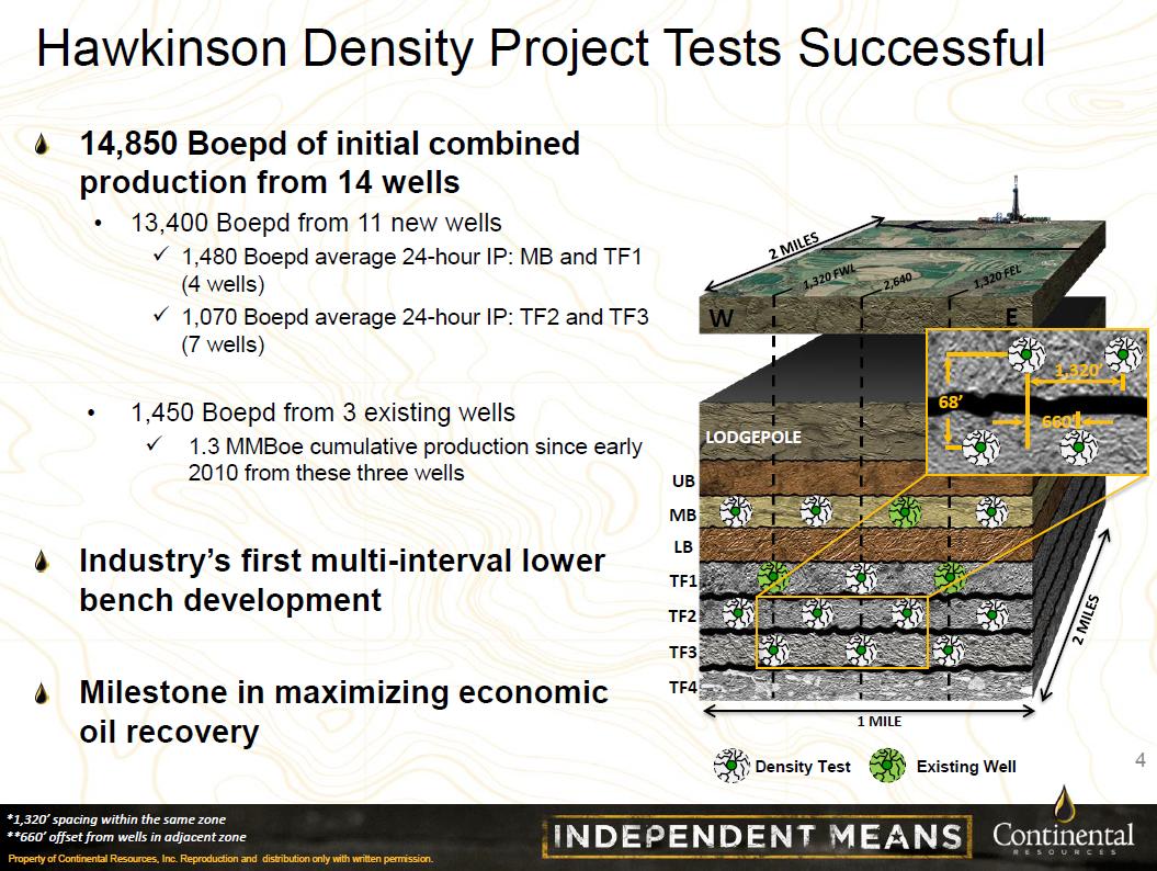 Another reason the Bakken is a unique formation is that it is what the industry calls a stacked play, meaning there are several oil-yielding formations stacked on top of each other. The lower sections, known as the Three Forks, have been left mostly untouched by most drilling operations aside from some test wells, but drillers have de-risked this formation and are now looking to incorporate it into the normal drilling program. With four layers of oil plays on top of each other, Continental is looking to drill all of these regions from a single pad. At a recent test, the company was able to generate returns on a 14 well pad, and the company plans to revisit some of its older producing regions to drill as many as 30 well pads.