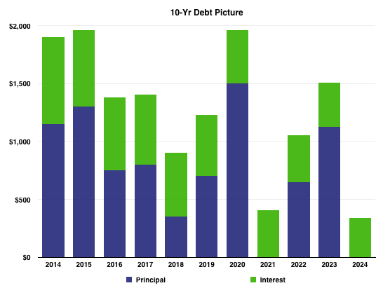Before we compute any debt-related calculations, or make any judgments about an MLP's fiscal fitness, we have to know exactly what we're dealing with. The chart below tells Enterprise's debt story for the next 10 years, including interest.