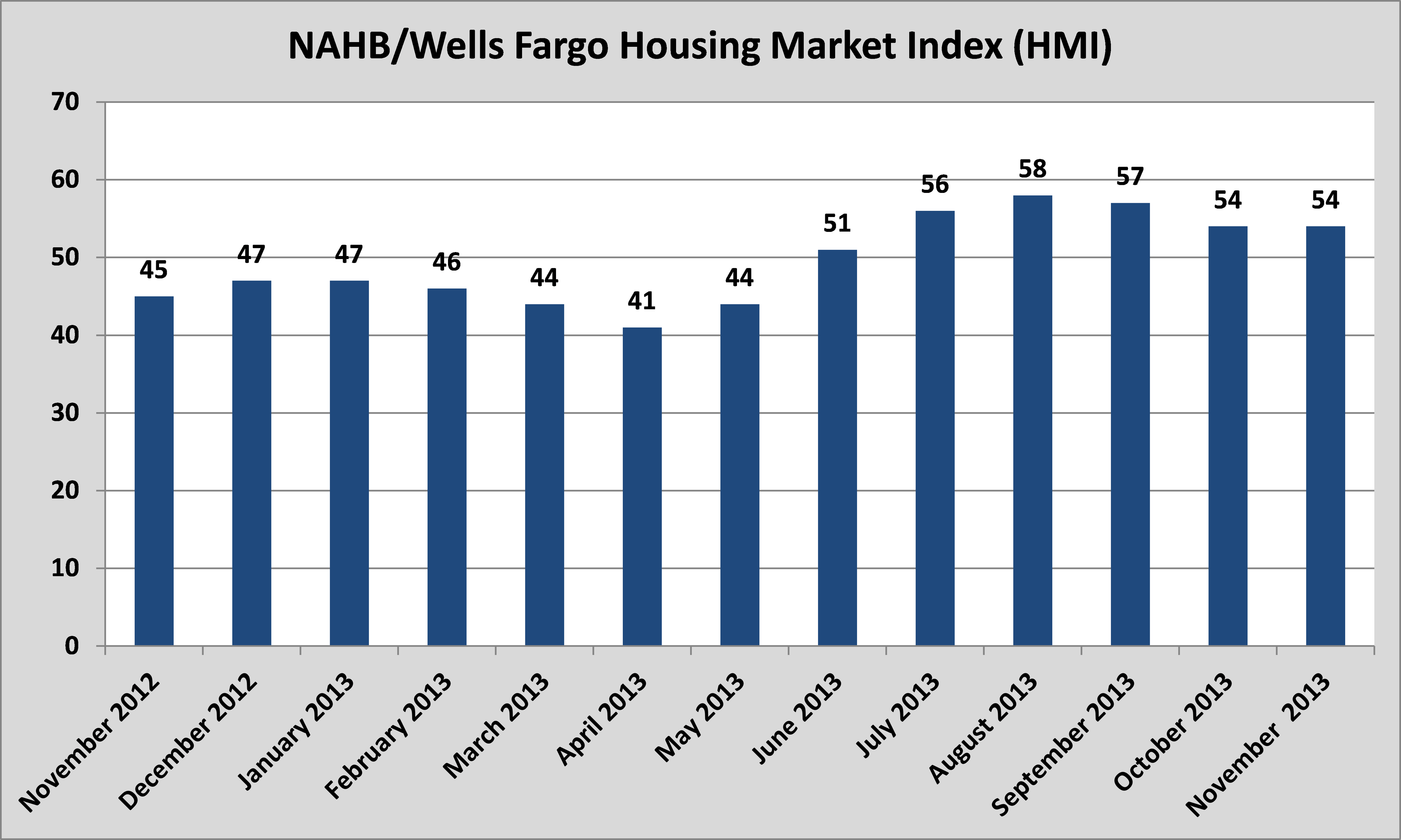 Homebuilders' confidence in the market for newly built single-family homes remained steady in the latest report from the National Association of Home Builders (NAHB) and Wells Fargo. They reported today a preliminary single-family homebuilder confidence reading for November of 54, which is unchanged from the downwardly revised level seen in October in the Housing Market Index (HMI). The reading of the HMI over the previous year is available in the chart below: