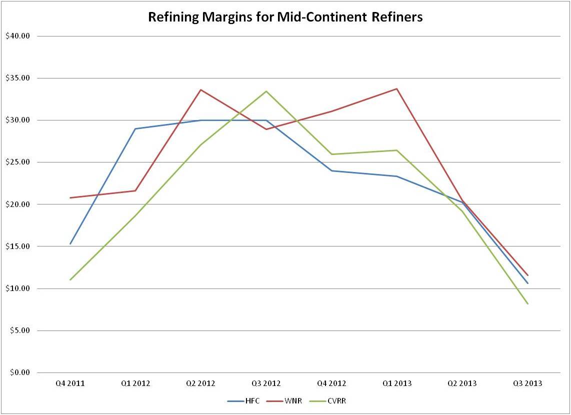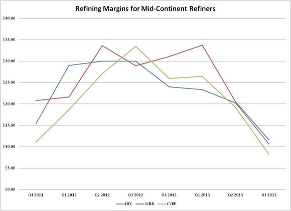 At the time, this was a party for refiners that had a majority of their refining capacity in the middle U.S, including CVR Refining, HollyFrontier (HFC +0.00%), and Western Refining (WNR +0.00%). Unfortunately, the party didn't last long. As new pipelines have been built to deliver more crude to the Gulf Coast, and rail shipments are sending crude to the East and West coasts, margins for these players have fallen back to what they were two years ago.