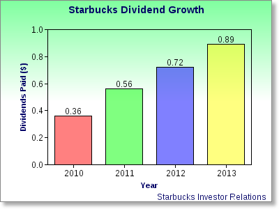 Currently, Starbucks is on pace to pay a total of $1.04 in dividends in fiscal 2014, representing a 16.9% growth from fiscal 2013. However, I believe it will return a little more than this since it has raised its dividend in the fourth quarter for the last three consecutive years. I think it is safe to assume Starbucks will increase its quarterly dividend to at least $0.30 by the conclusion of 2014.