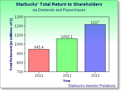 Starbucks has been one of the most active companies in the market when it comes to repurchasing shares. By repurchasing shares, Starbucks reduces the total shares outstanding, which increases earnings per share and makes the remaining shares more valuable. In fiscal 2013, Starbucks repurchased approximately 10.8 million shares of its common stock for roughly $588.1 million. With dividend payments totaling $628.9 million and repurchases of $588.1 million, this means that Starbucks returned over $1.2 billion to its shareholders in the fiscal year. Take a look at the total value returned to shareholders since 2011: