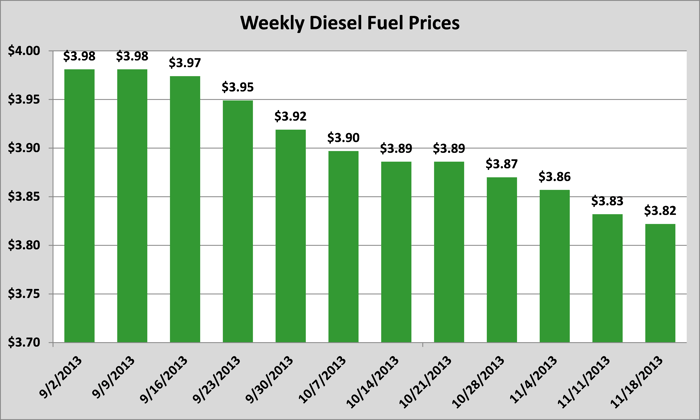 Diesel prices fell week over week, as prices moved down from $3.83 per gallon to $3.82 per gallon. This is actually the 12th week in a row in which diesel prices have either remained flat or fallen week over week, as shown in the chart below:
