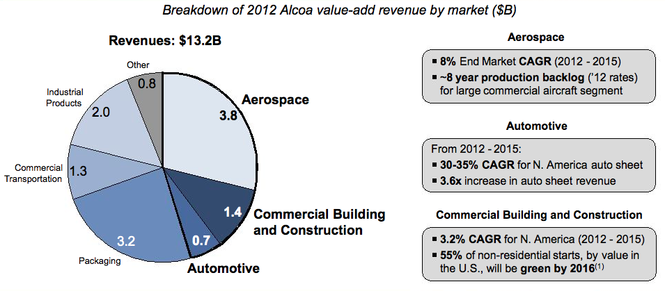 Indeed, Alcoa's value-add businesses now account for 57% of total revenues and 79% of after-tax operating profits. It's looking to add more than $2 billion in new revenues to its business, and though a good part of the plan comes from firming prices in the marketplace, it's also the growth of these value-add businesses that will drive its momentum forward.