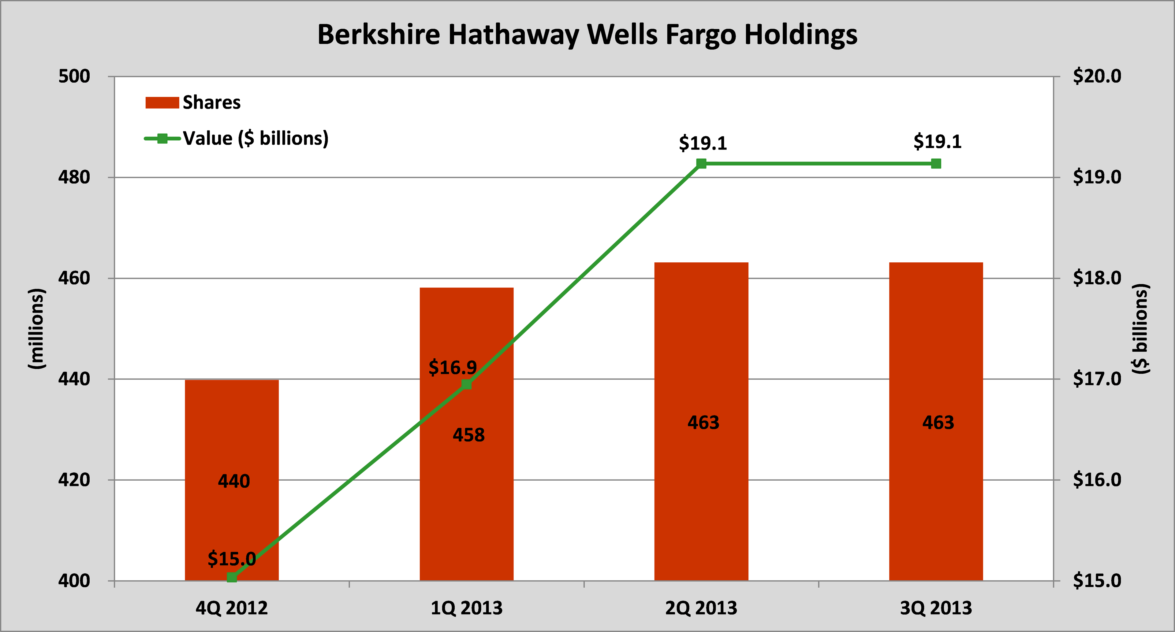 While the biggest gain in position came between the first and second quarter of this year -- it is interesting to note that Berkshire Hathaway has added small incremental gains with each passing quarter. Compare that to Wells Fargo, where Buffett added a sizable position between the first and second quarter of this year, but otherwise his position has remained relatively stable: