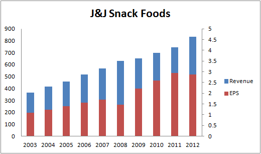 Demand is stable, its profit margin hardly moves from year to year, and it typically holds an inordinately large amount of cash on its balance sheet. Despite these things, J&J consistently increases revenue and earnings per share by making prudent acquisitions of small snack companies.